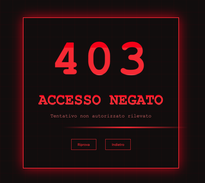 Una pagina scenografica che simula un sistema di sicurezza digitale avanzato. Lo schermo è dominato da un’estetica cyber-tech con toni rosso intenso e nero, effetti glitch, scanline e bagliori intermittenti. Il messaggio “403 - ACCESSO NEGATO” è centrale, pulsante e disturbato visivamente, mentre elementi decorativi come griglie digitali, segnali lampeggianti e particelle creano un senso di blocco e allerta. Ideale come schermata di errore ad alto impatto visivo.