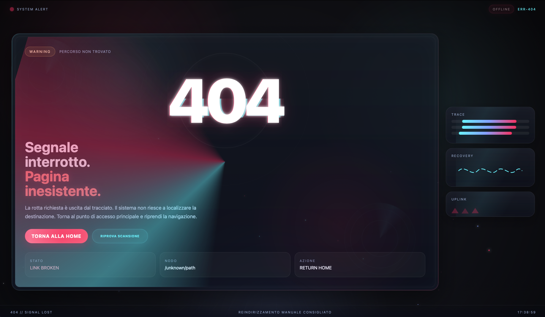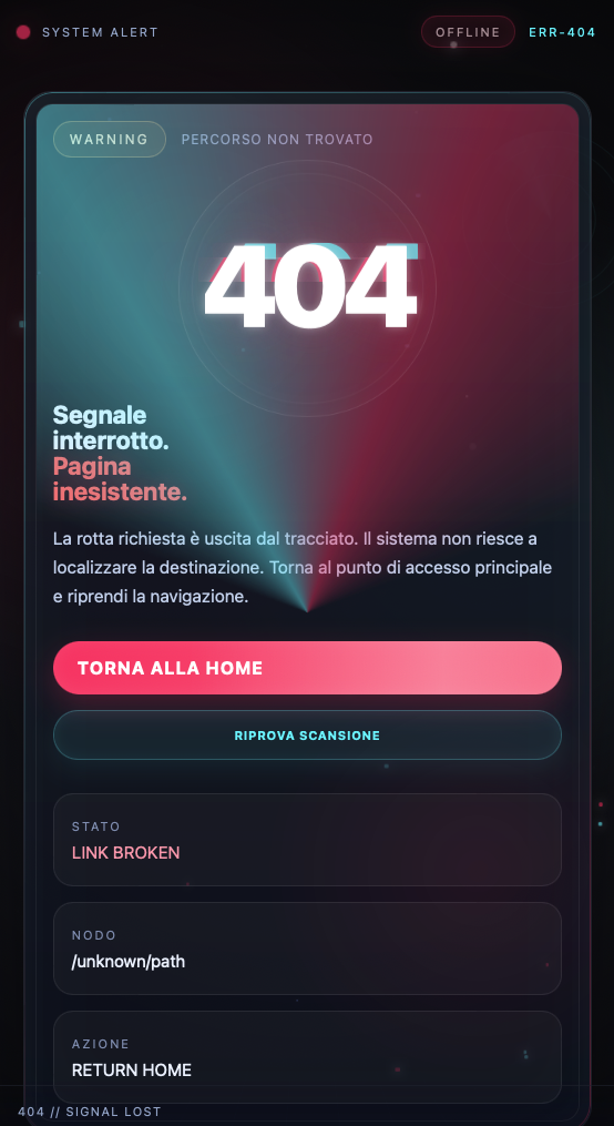Una landing fullscreen che trasforma l’errore 404 in una scena digitale drammatica, tra glitch, scanline, bagliori rossi e segnali di sistema fuori controllo. Il numero “404” domina il centro pagina con effetto RGB split, distorsioni intermittenti e vibrazioni controllate. Attorno, linee radar, particelle, griglia prospettica e indicatori di warning creano un ambiente techno-cyber intenso ma leggibile. Il messaggio principale invita l’utente a tornare alla home con una CTA luminosa e pulsante. La pagina è responsive, fluida su desktop e mobile, senza librerie esterne. Tutti gli elementi grafici sono realizzati con CSS, SVG inline e JavaScript vanilla. Il risultato è scenografico, molto animato e coerente con il tema “Errore 404”.